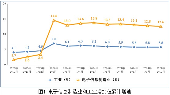 1-10月,规模以上电子信息制造业增加值同比增长12.6%,增速分别比同期工业、高技术制造业高6.8个和3.5个百分点。10月份,规模以上电子信息制造业增加值同比增长10.5%。
