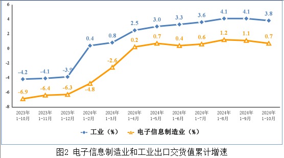 1-10月,规模以上电子信息制造业累计实现出口交货值同比增长0.7%,较1-9月回落0.4个百分点。10月份,规模以上电子信息制造业实现出口交货值同比下降0.1%。