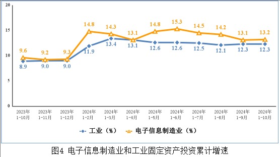 1-10月,电子信息制造业固定资产投资同比增长13.2%,较1-9月提高0.1个百分点,比同期工业、高技术制造业投资增速分别高0.9个和4.4个百分点。
