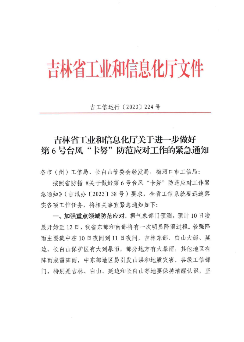 吉林省工业和信息化厅关于进一步做好第6号台风“卡努”防范应对工作的紧急通知