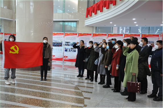 观展结束后,党员干部面向鲜红的中国共产党党旗,举起右拳,重温入党誓词“我志愿加入中国共产党,拥护党的纲领,遵守党的章程,履行党的义务……”,铿锵有力的宣誓声响彻一楼展览大厅。