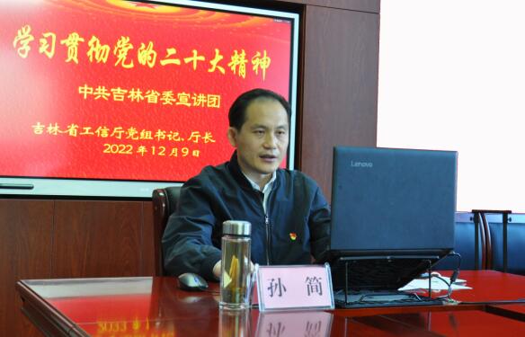 日,省委宣讲团成员、省工信厅党组书记、厅长孙简以视频方式与吉林化纤集团职工和全省工信系统广大党员干部相约线上,宣讲党的二十大精神。孙简围绕坚定推动党的二十大决策部署在吉林落地生根、以
